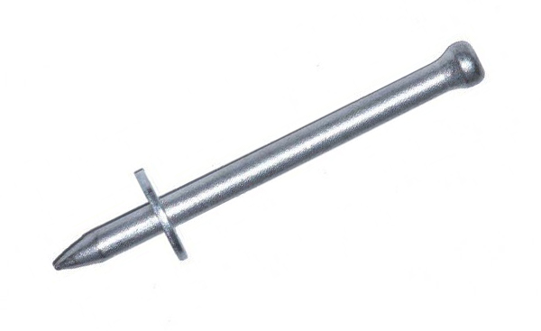 Hřebík nastřelovací ocelový s rovnou hlavou a jednou podložkou. Použití ve stavebnictví pro upevnění kovových svorek, lišt a pásů. Jejich tepelné zušlechtění umožňuje připevňování těchto prvků do stavebních materiálů jako beton, cihla nebo kámen.