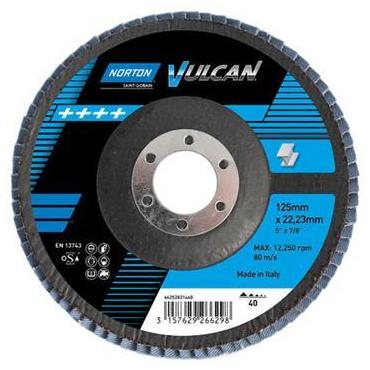 Lamelový kotouč NORTON-Vulcan se sklolaminátovou podložkou, použití na sváry a hrany, na nerezovou a legovanou ocel, neželezné kovy, dřevo a laky, nový kotouč má vylepšenou podložku s bavlněnou tkaninou pro zvýšení odolnosti, pružnosti a odolnosti proti opotřebení, vulkanové lamely poskytují vynikající brousicí efekt pro všechny aplikace, dlouhou životnost na tvrdé broušení a materiály včetně oceli a nerezové oceli, stejně jako měkčí kovy, jako je hliník.