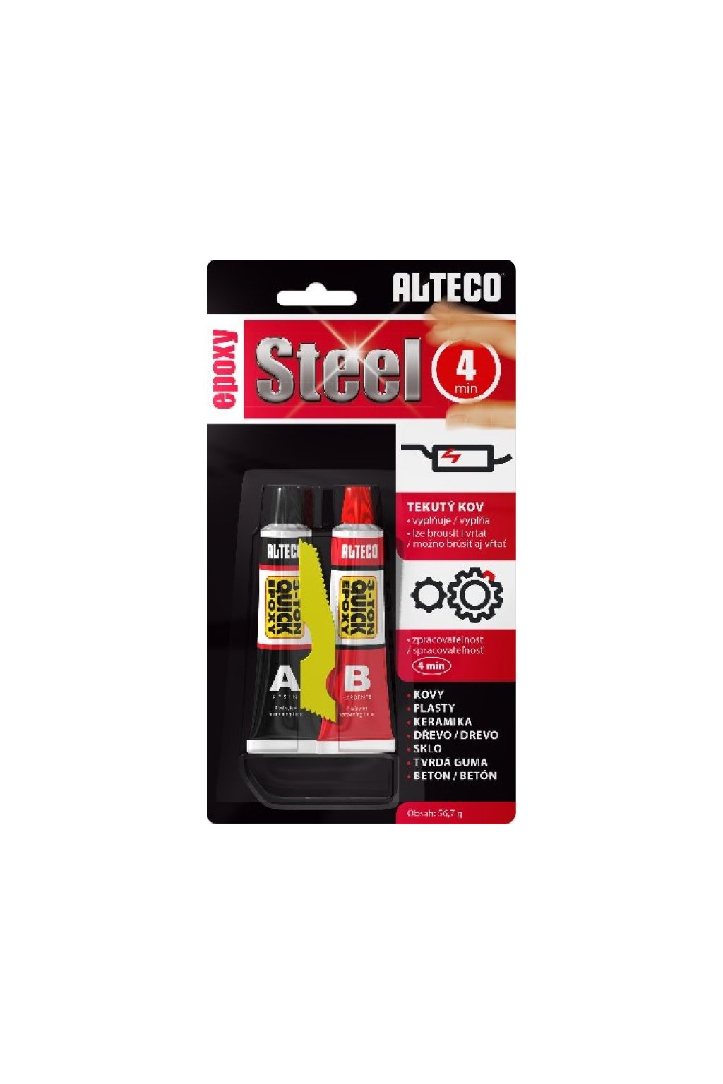 Lepidlo ALTECO Epoxy Steel je dvousložkové epoxidové lepidlo s kovovým plnidlem (tekutý kov) a zpracovatelností 4 minuty. Jedná se o takzvaný tekutý kov pro nejnáročnější opravy, lepení a lepící svařování za studena. Toto dvousložkové velmi pevné epoxidové lepidlo umožňuje lepit a opravovat i ty nejnáročnějí spoje s vysokou smykovou pevností min. 130 kg/cm2. Tepelná odolnost je po vytvrzení -20°C až +120°C.