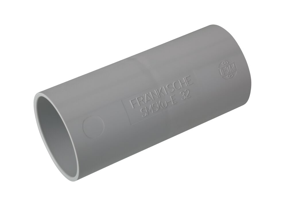 FRÄNKISCHE Spojka SMSKu-E O32mm, -25 až +60°C, PVC-U, šedá. SMSKu-E je plastová násuvná spojka z PVC-U v šedé barvě (RAL 7035), která brání šíření plamene. Tato násuvná spojka se používá pro plastové pevné trubky isofix-EL-F, FPKu-EM-F a FPKu-ES-F.