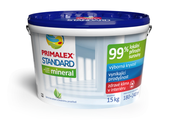 Primalex STANDARD Mineral je bílý vnitřní malířský nátěr na bázi přírodních surovin, který splňuje veškeré základní požadavky na užitné vlastnosti bežných a nenáročných prostot. Trvale garantuje výbornou kryvost, vynikající paropropustnost a bělost (~ 85 %BaSO4). Díky 99% přírodnímu složení bez obsahu těkavých látek pomohá udržovat čistý a zdravý domov.