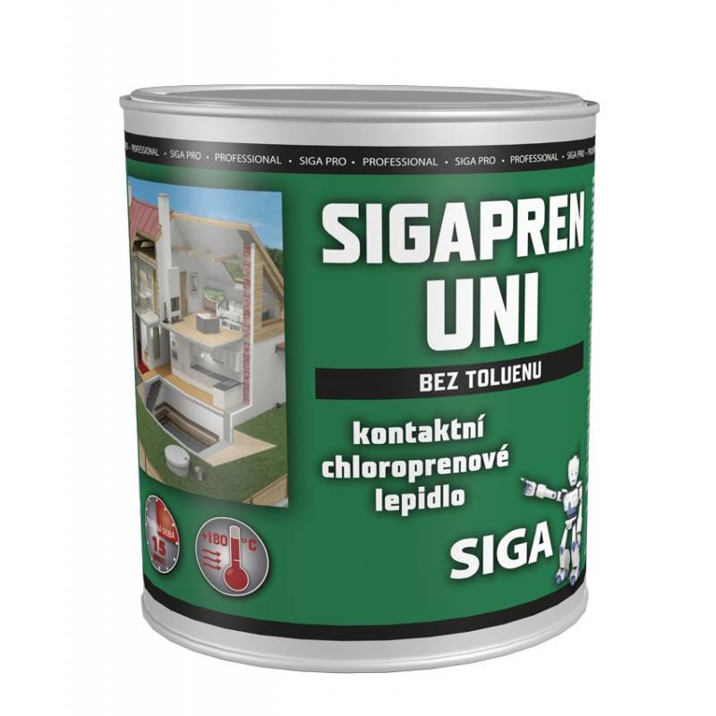 Sigapren uni bez toluenu je speciální chloroprenové kontaktní lepidlo, které má široké uplatnění v domácnosti a průmyslu, použití pro lepení papíru, kůže, textilu, keramiky, skla, kovů, podlahových krytin z korku, PVC, gumy (lisované dlaždice), textilních podlahovin, soklových lišt, schodišťových hran, keramických obkladů na umakart apod. Není vhodné na lepení polystyrenu, měkčeného PVC, PE a PP. Vzniklý spoj zůstává trvale pružný, odolný vodě a běžným chemikáliím.
