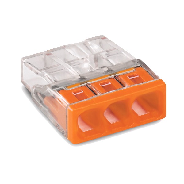 Wago svorka je určená pro připojení 3 vodičů o průřezu 0,5 - 2,5 mm2 pro bezšroubové spojení vodiče, průhled v krytu pro všechny běžné zkoušečky.