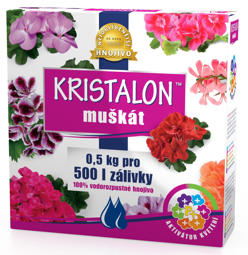KRISTALON Muškát je hnojivo nové generace s unikátním složením a aktivátorem kvetení, které udržuje rostliny v intenzívním růstu a zajišťuje syté barvy květů, bohatá květenství a bujný kořenový systém. Díky svému účinku je vhodné nejen pro muškáty, ale i pro ostatní balkónové rostliny jako surfinie, begonie, fuchsie, lobelky, bakopy, vějířovky, gazánie, kejklířky a další. Aktivátor kvetení obsažený v hnojivu dodává rostlinám 50 % fosforu ve formě polyfosfátů, což je pro ně přijatelnější a účinnější forma. Hnojivo má rychlý a viditelný účinek, který přispívá ke zdravému růstu rostlin a kvetení. Obsah balení 0,5 kg vystačí na 500 litrů zálivky.