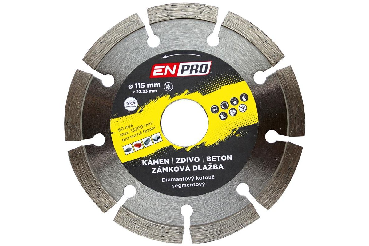 Diamantové kotouče prémiové značky ENPRO, která je zárukou profesionální kvality. ENPRO kotouče vynikají především vysokou kvalitou použitého materiálu a dlouhodobou životností. Certifikace MPA. Segmentové kotouče jsou vhodné na pevnější materiály jako jsou: kámen, zdivo, beton, zámková dlažba, žula, mramor. Lze provádět suché i mokré řezy.