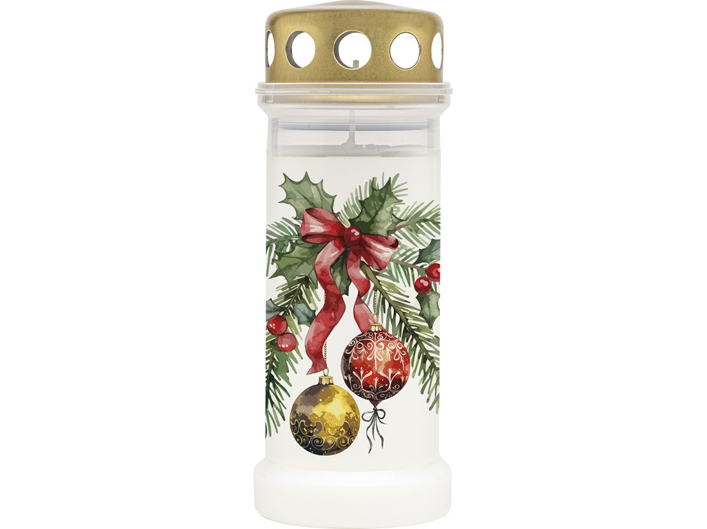 Prémiový hřbitovní vklad od značky Bolsius s víčkem a stylovým vánočním motivem je důstojným a zároveň estetickým způsobem, jak uctít památku blízkých v zimním období. S náplní o hmotnosti 220 g nabízí až 70 hodin hoření. Víčko chrání plamen před větrem a nepřízní počasí. Šířka: 6,7cm Hloubka: 6,7cm Výška: 17cm