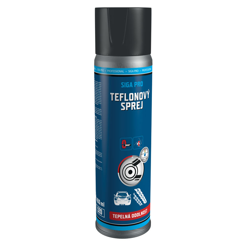 SIGA PRO TEFLONOVÝ SPREJ je univerzálně použitelný kluzný prostředek určený pro automobilový a strojní průmysl, dílnu i domácnost, odolný proti teplotám od -50°C až do +260°C, solím, zásadám a kyselinám. Přípravek se