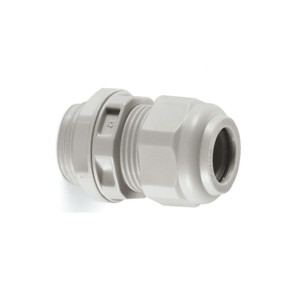 Kabelová vývodka, plastová, světle šedá, závit Pg7, pro průměr kabelu 2,5 až 6,5 mm, délka závitu 8 mm.