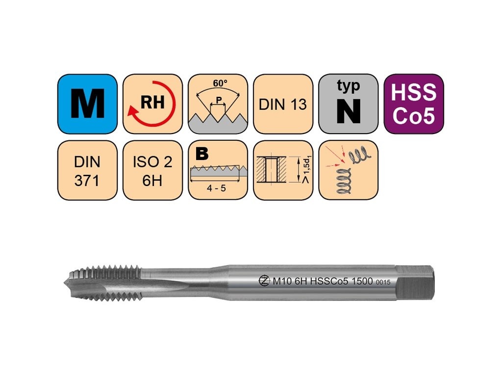 Strojní závitník pro metrický závit s přímou drážkou a lamačem třísek, pro oceli s pevností do 800N/mm2